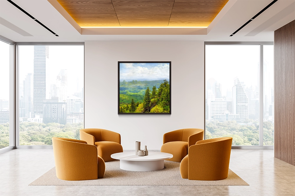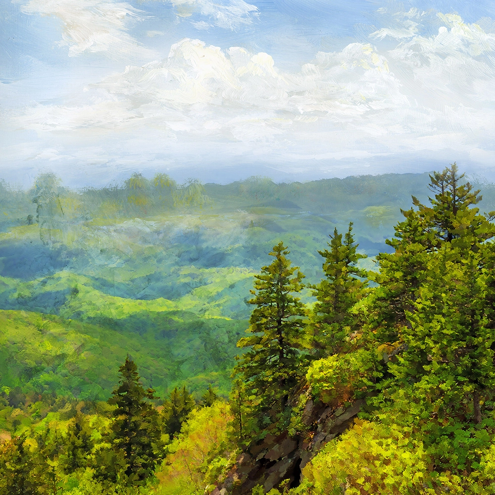 Lush mountain landscape with evergreen trees, rolling hills, and a bright sky.