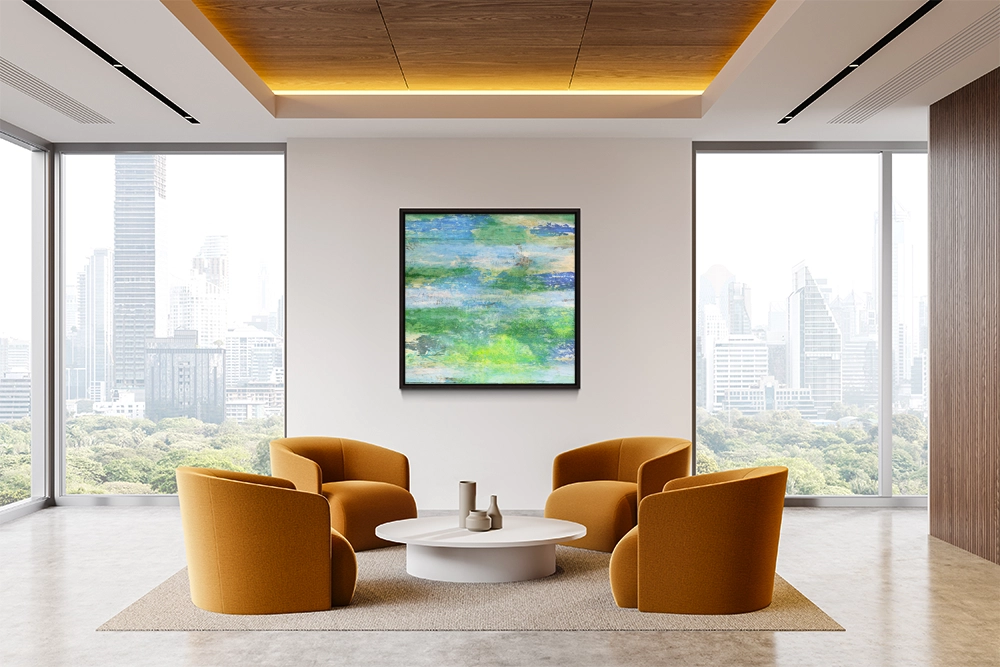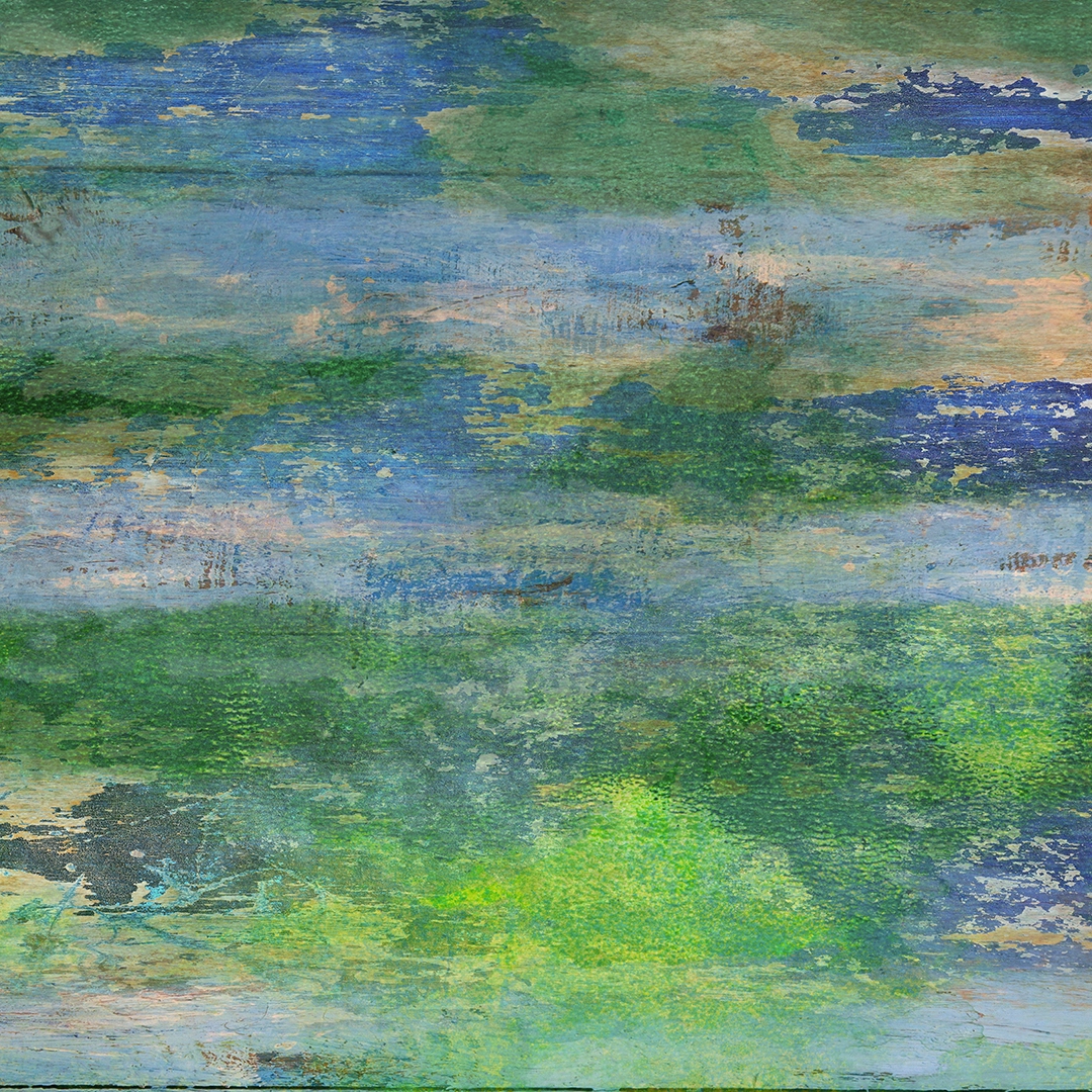 Lush greens and soft blues blend like forest reflections on flowing water.