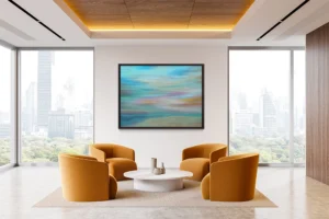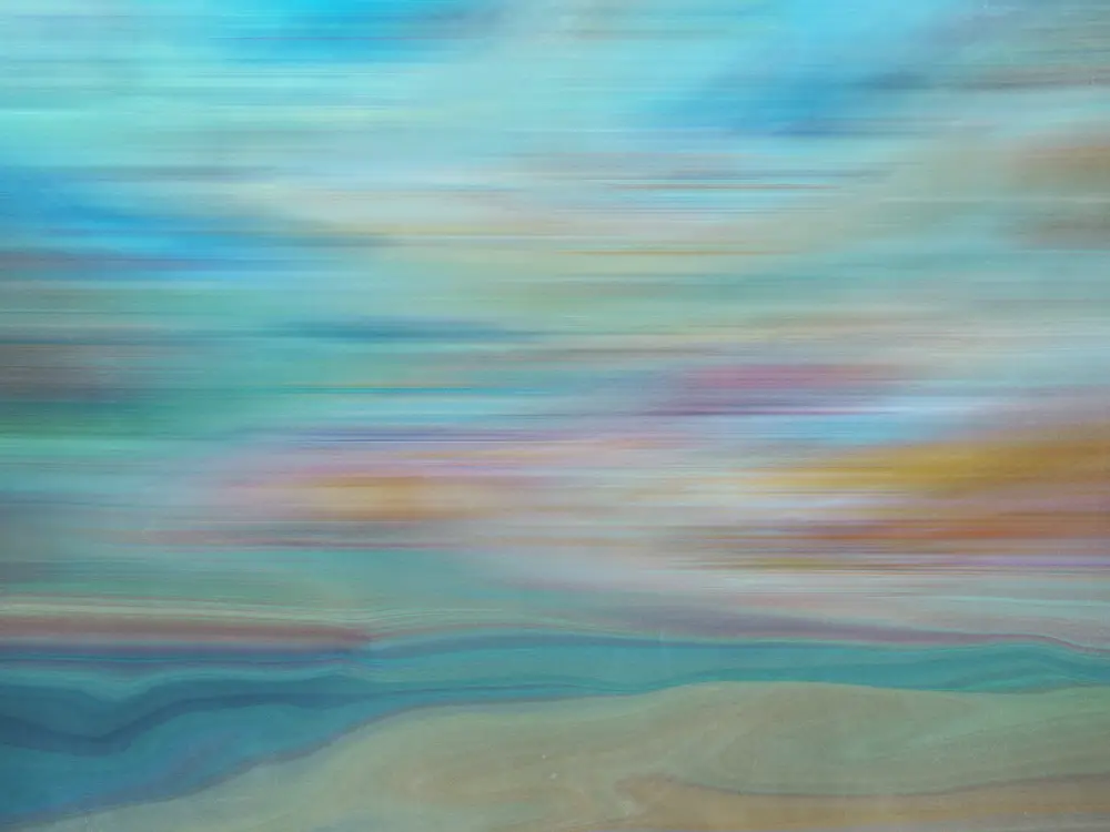 A soft, abstract landscape with vibrant blues and greens, subtly touched by wisps of pink and yellow.