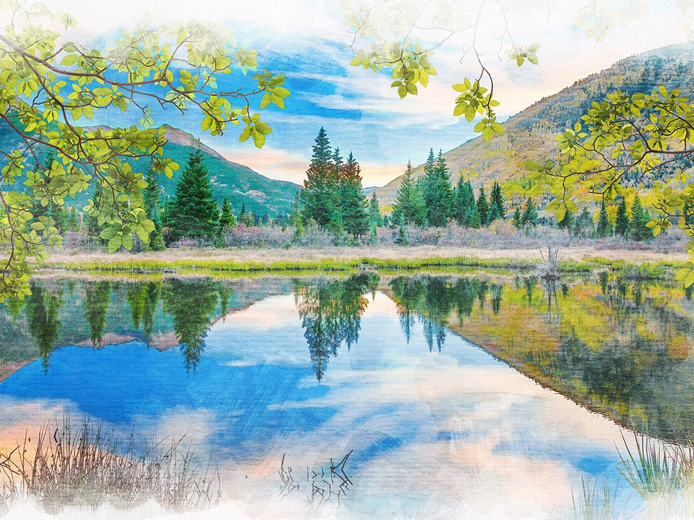 A serene mountain scene reflected in water, with soft blues, greens, and touches of pink.