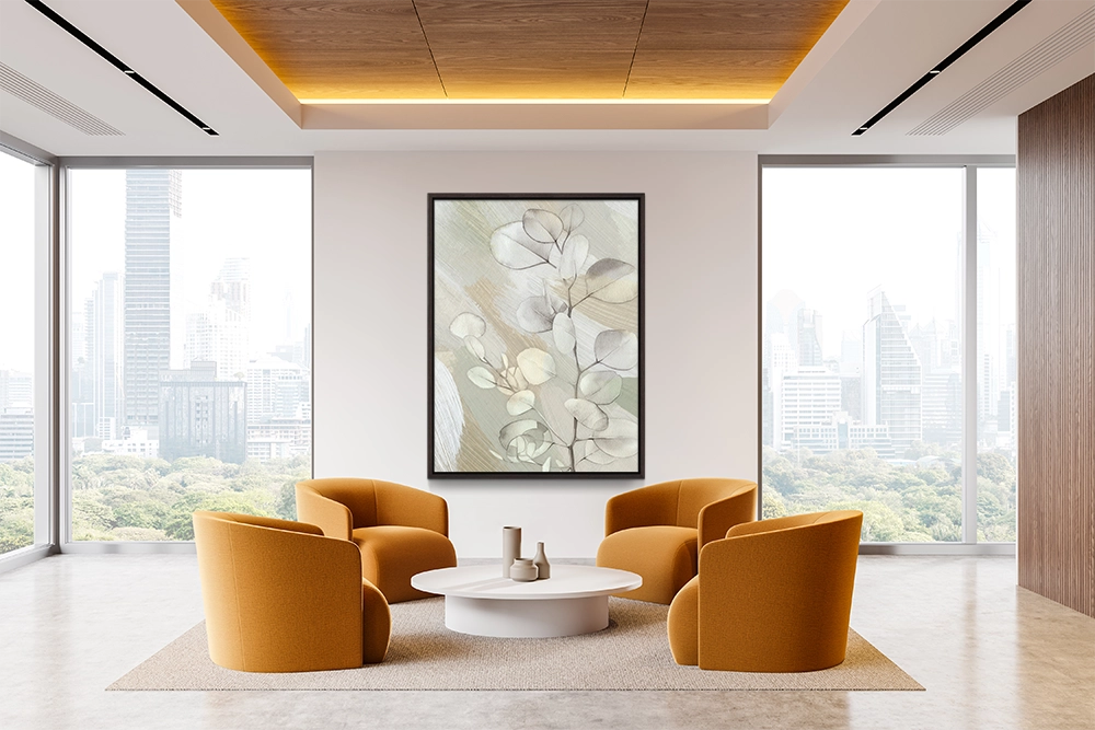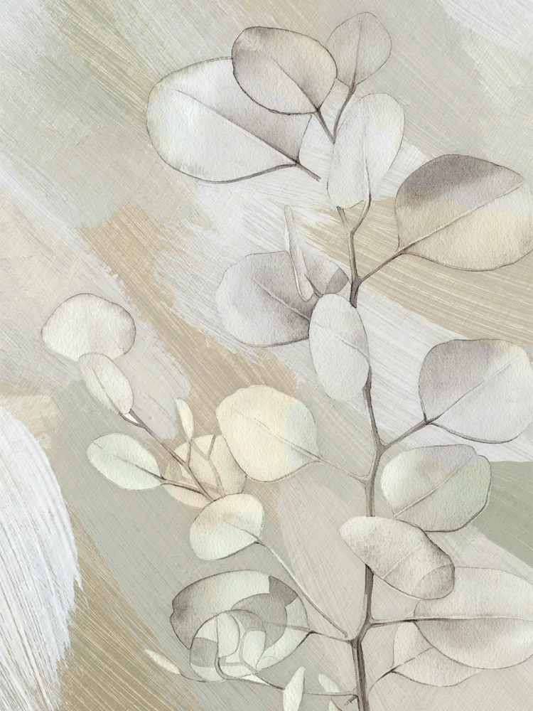 Soft eucalyptus leaves in muted sage tones drift gently across textured background.