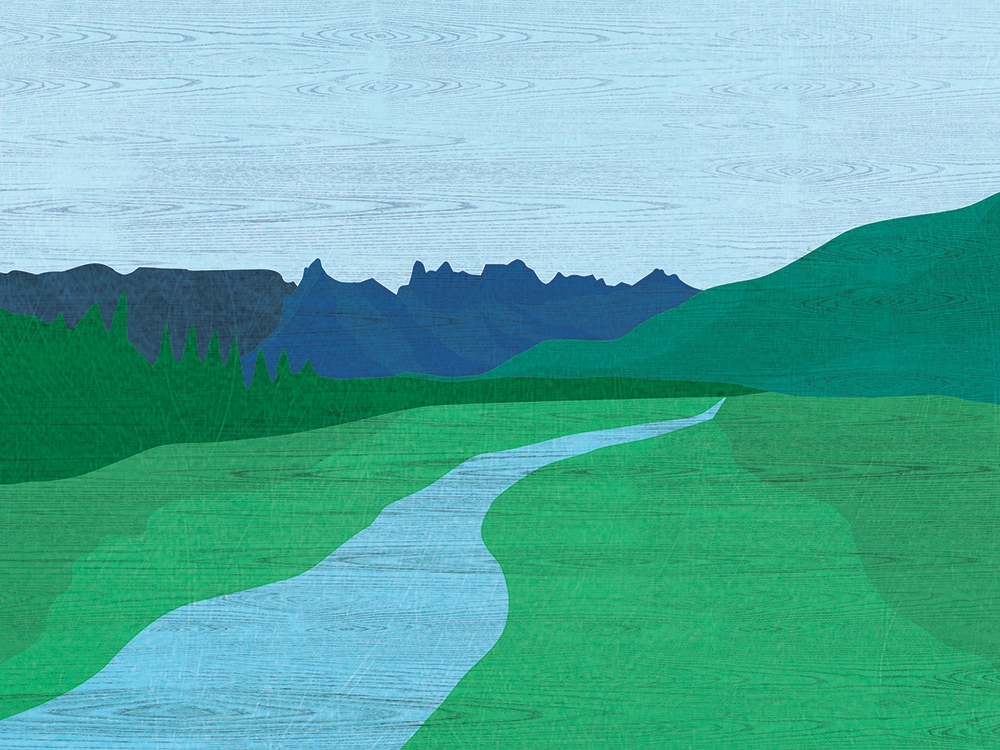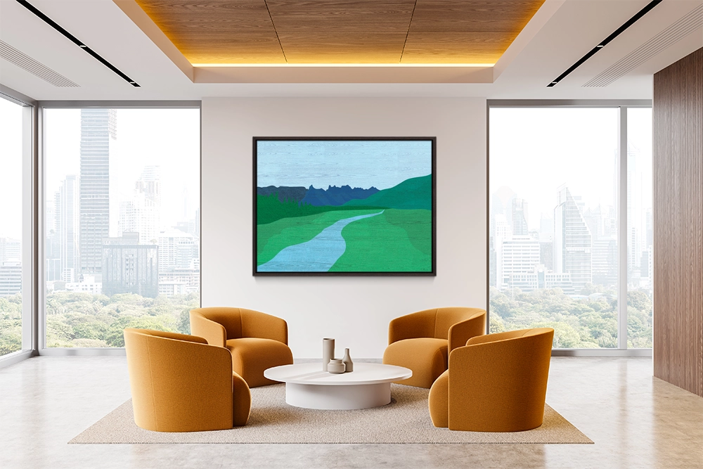 Minimalist landscape with winding river, green fields, and layered blue mountain silhouettes.