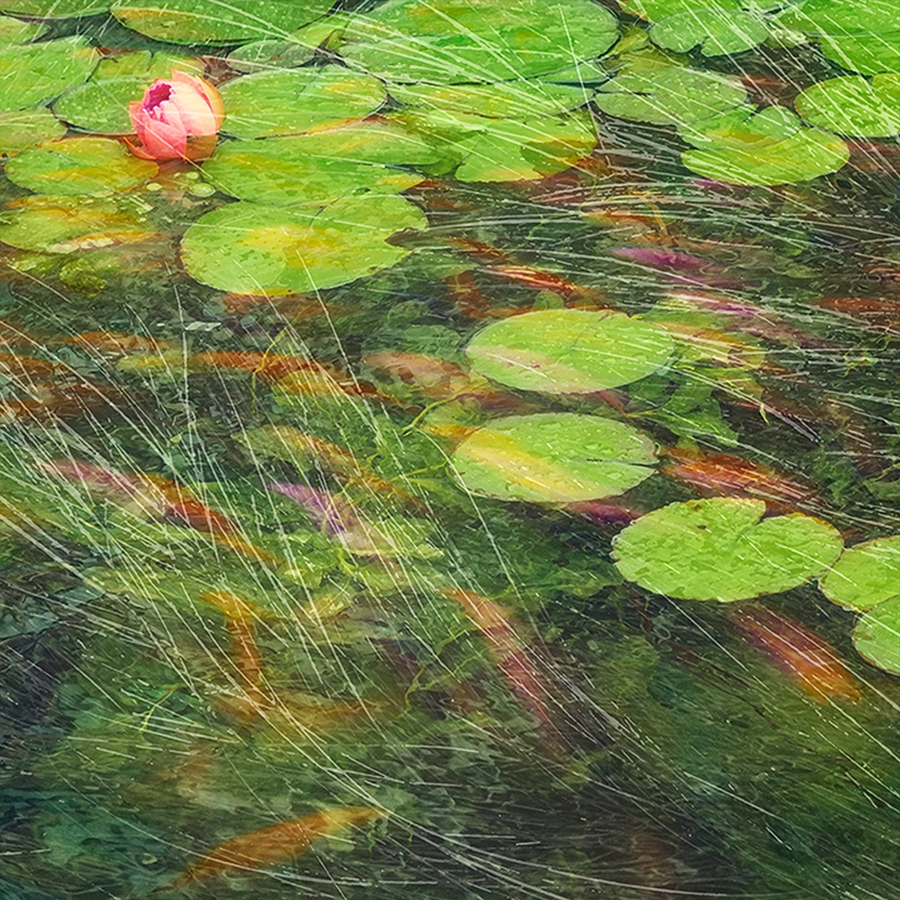 Koi fish swim beneath lily pads, sunlight streaking through rippling green water.