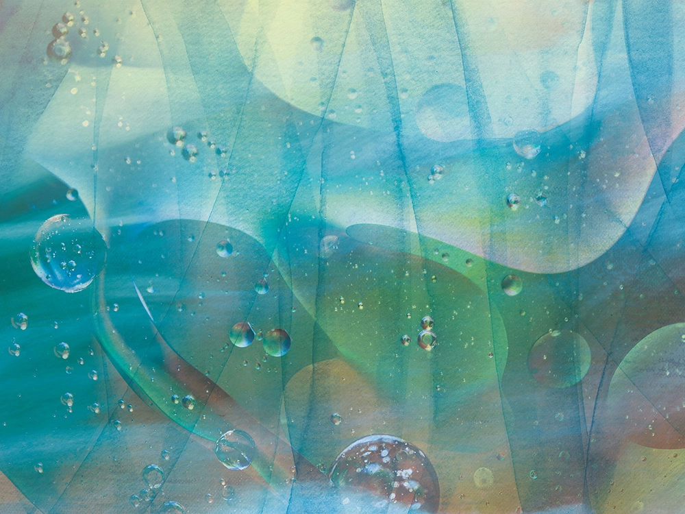 A textured overlay of soft hues of blue and green with layers of movement and dew drops.