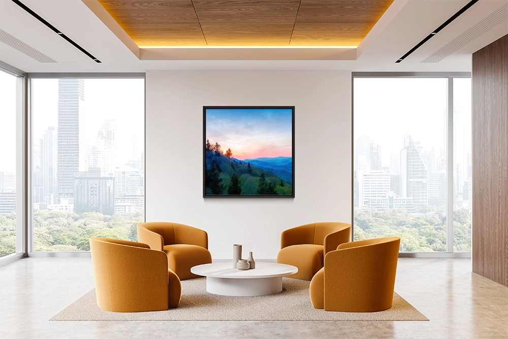 Sunset over layered forested hills with glowing sky and silhouetted trees.