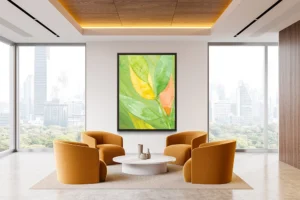 Vivid yellow, green, and coral leaves overlap, radiating warmth and natural energy.