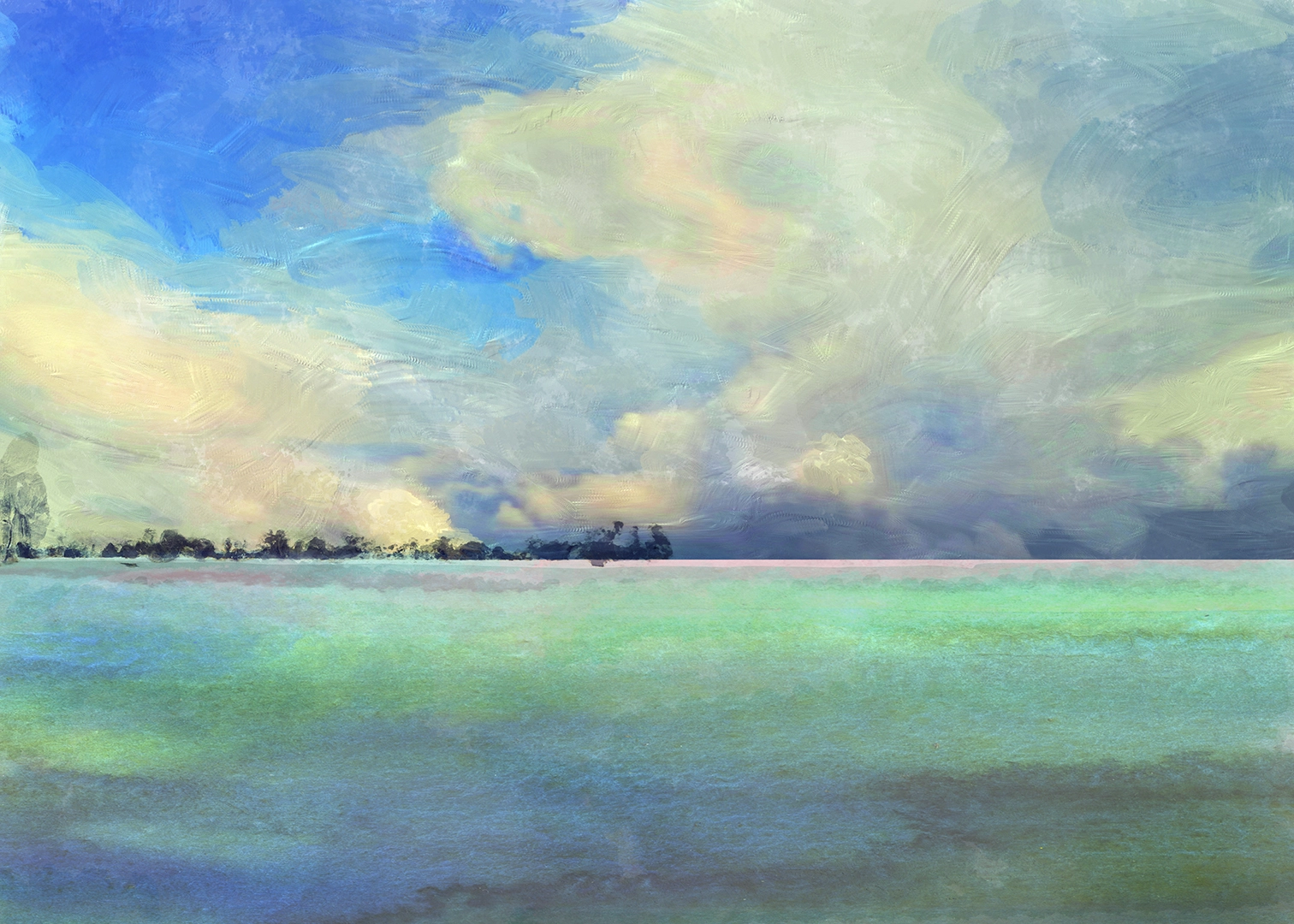 Soft pastel fields meet swirling skies in a dreamlike expanse of serenity.