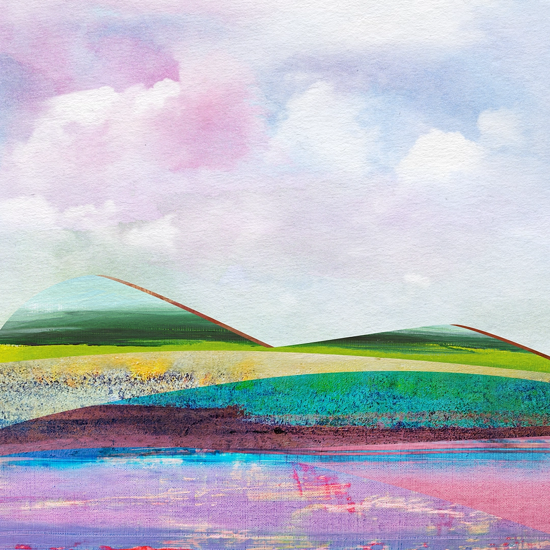 Cotton candy clouds watch over rolling stunning hills and an enchanting lake.