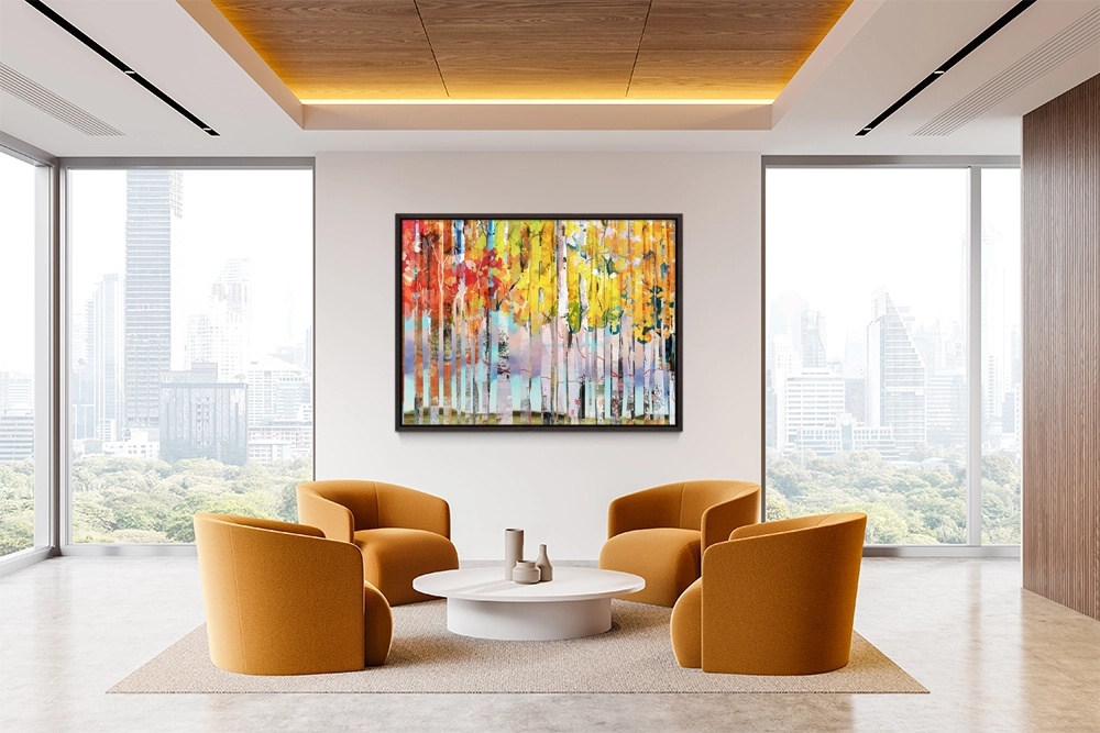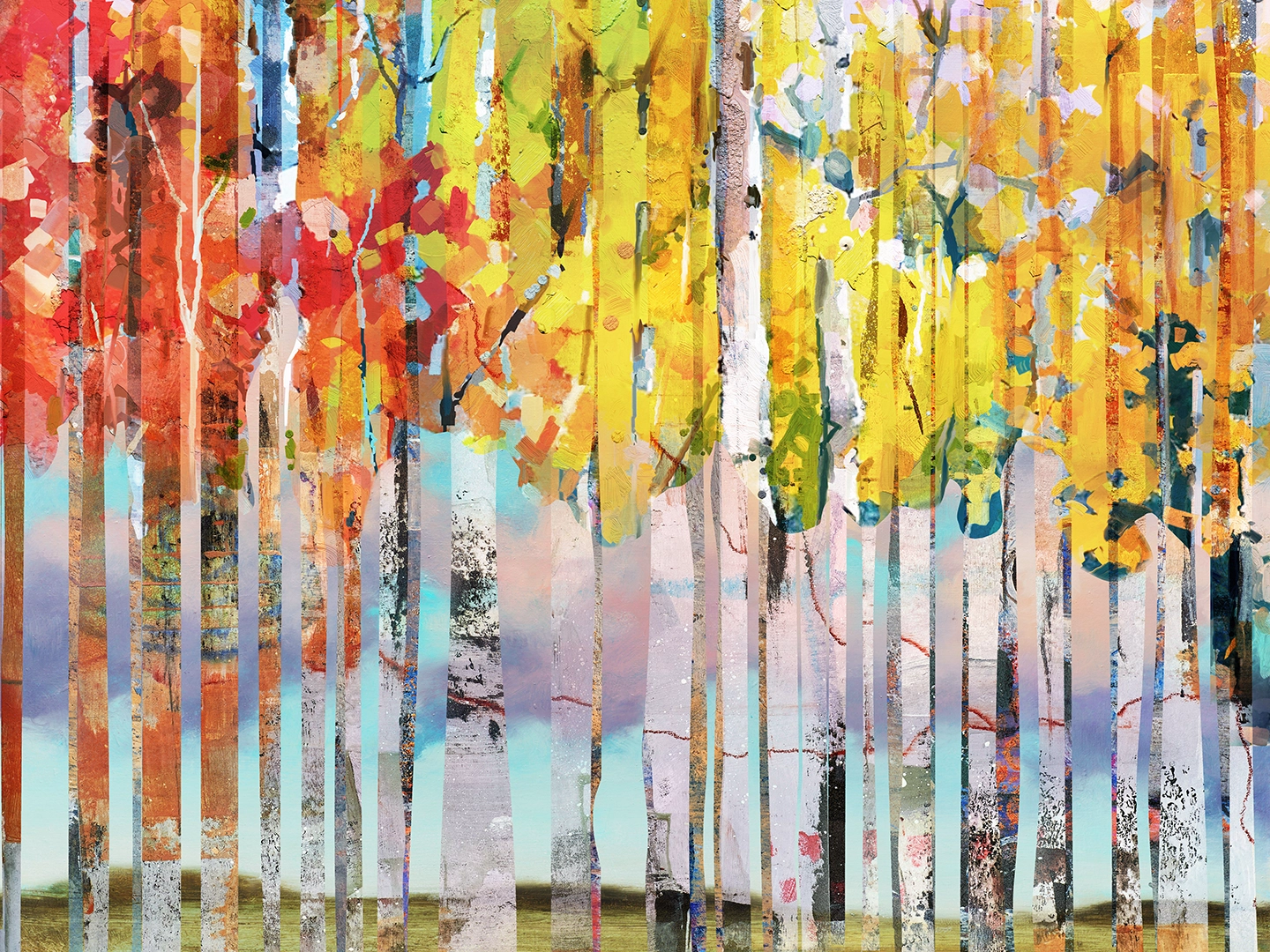 A colorful forest scene features vertical trees with majestic autumn leaves. The vivid hues of yellow, orange, and red create a lively atmosphere.