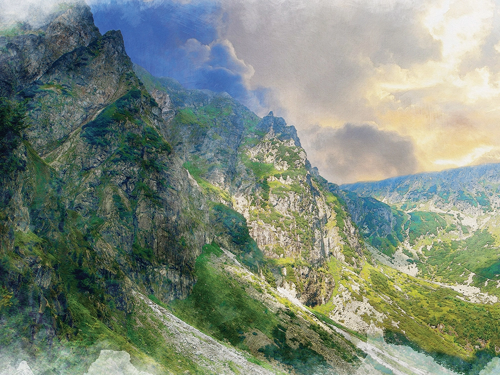 Mountain landscape with lush greenery, dramatic cliffs, and glowing sky.