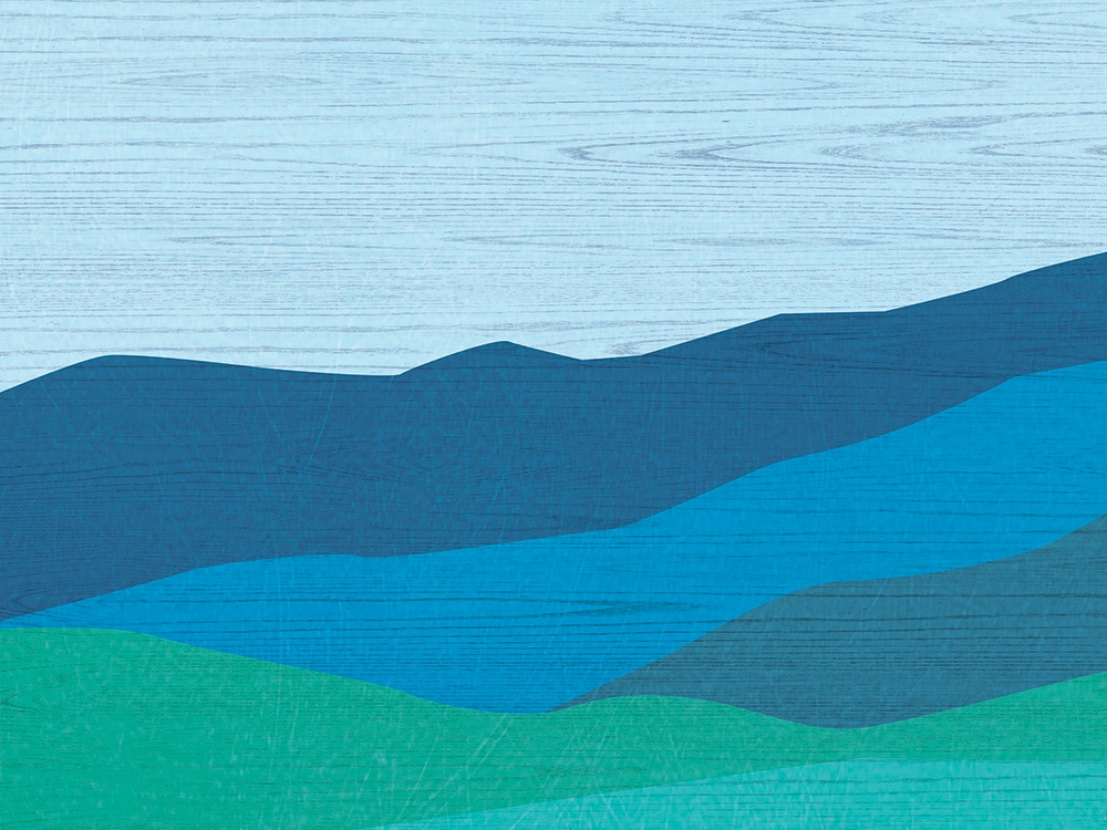 Layered hills in cool blues and greens form a minimalist mountain landscape.