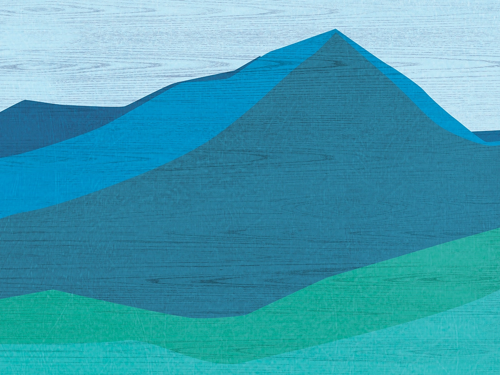 Layered hills in cool blues and greens form a minimalist mountain landscape.