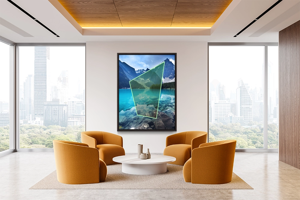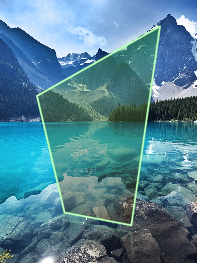 Mountain lake scene altered by glowing geometric overlay and visual distortion.