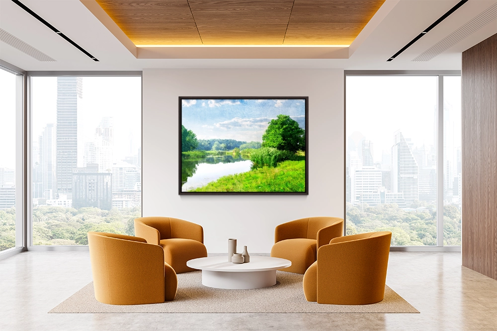 Lush riverside landscape with vibrant greenery, calm water, and soft sunlight.