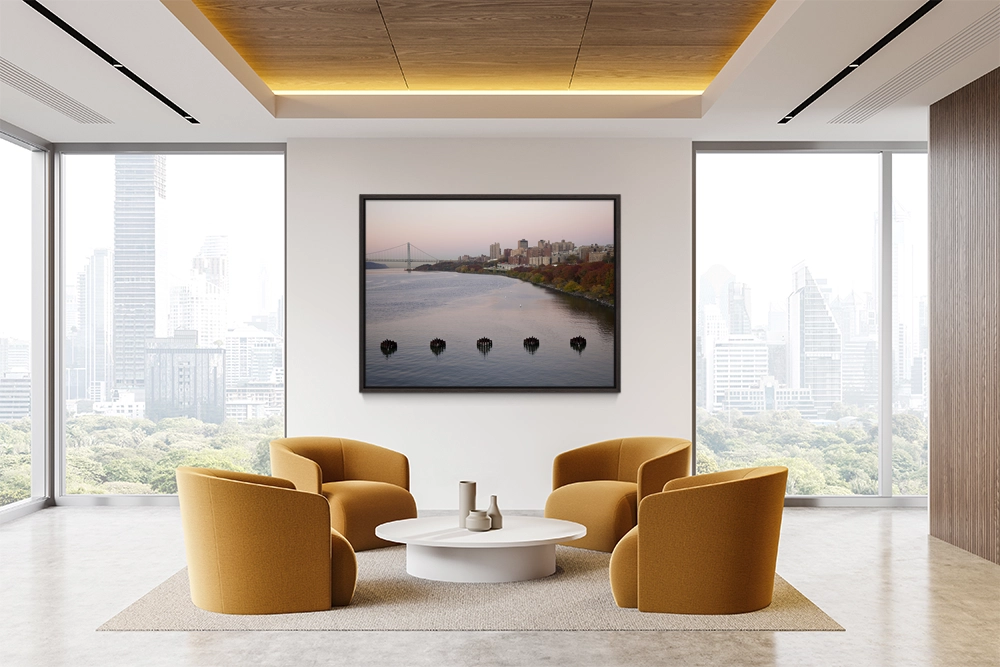 The Hudson river gleams along Riverside Park and the colorful autumn trees. The city nestled in the background, framed by George Washington Bridge.