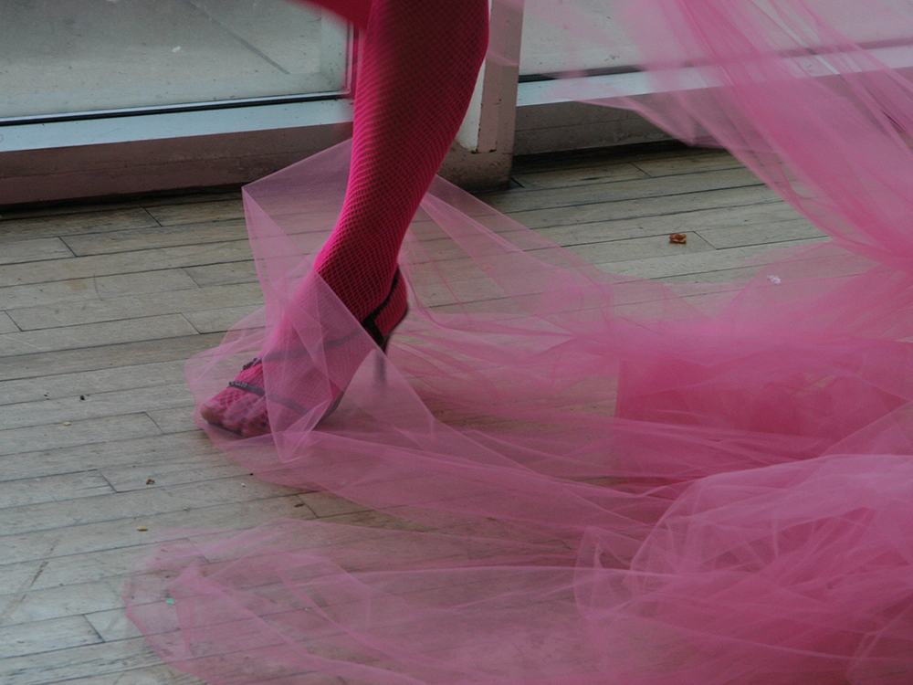 Pools of tulle ensnare a fishnet-wearing, heeled foot, ready to spin atop a messy dancefloor.