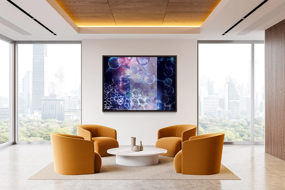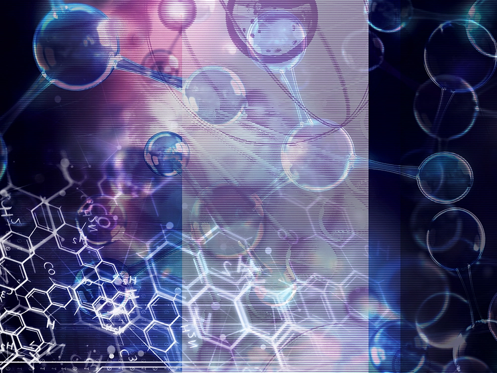 Layered visualization of molecules and chemistry with glowing spheres and hexagons.