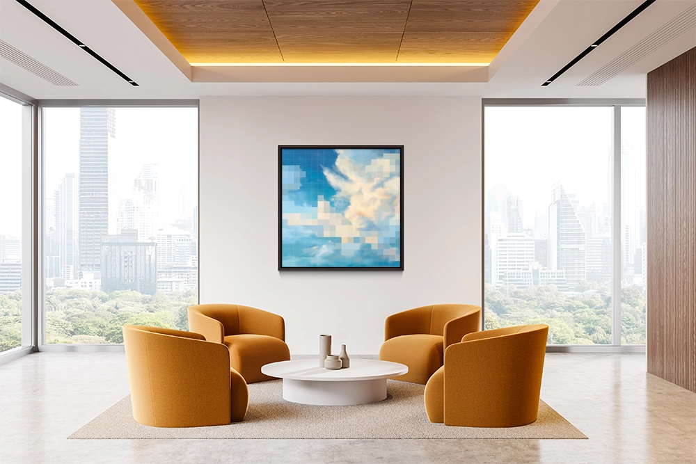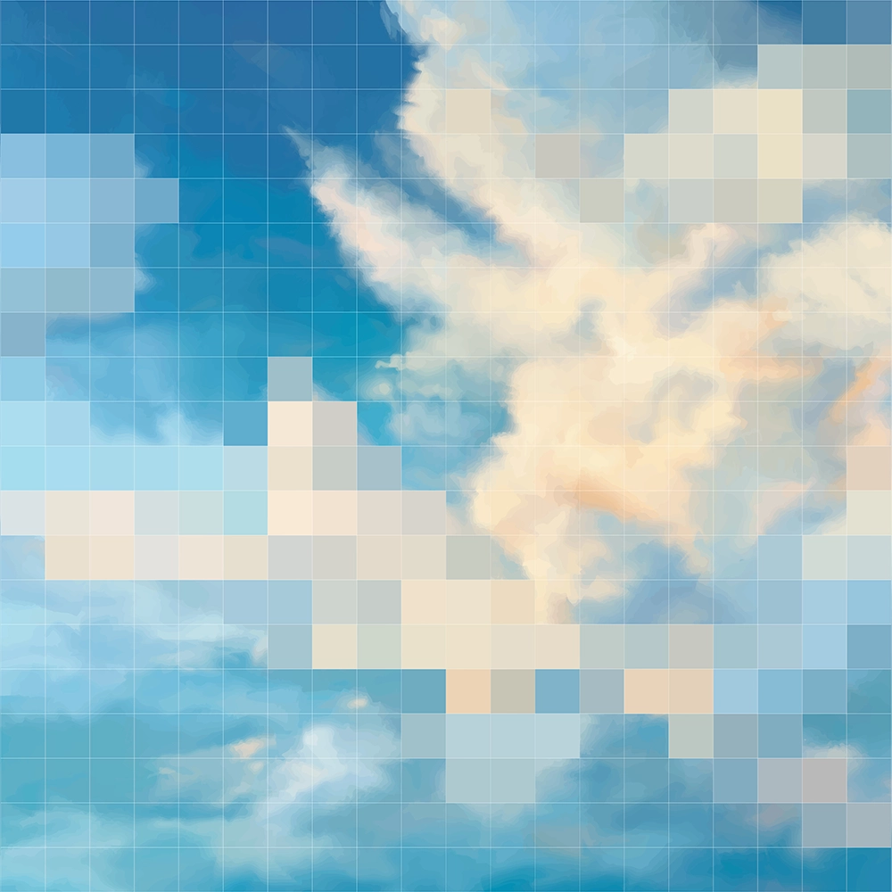 Pixelated sunset sky blending soft clouds and tranquil blues.