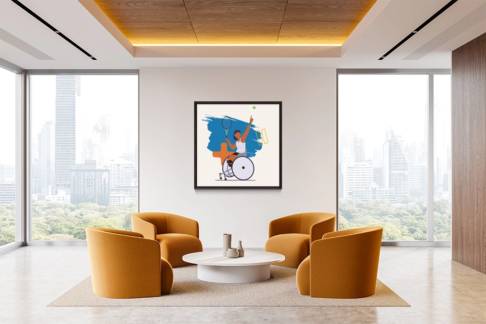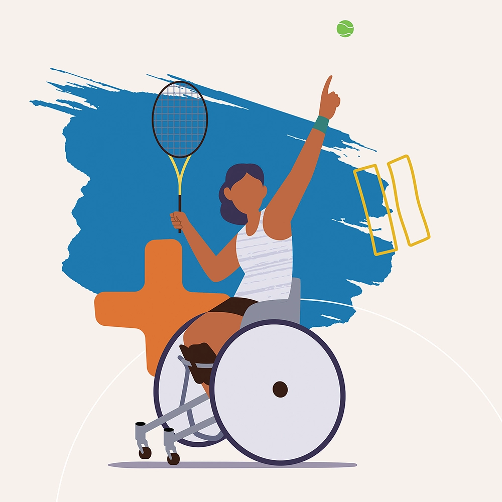 Wheelchair tennis player serving, highlighted by dynamic blue background.