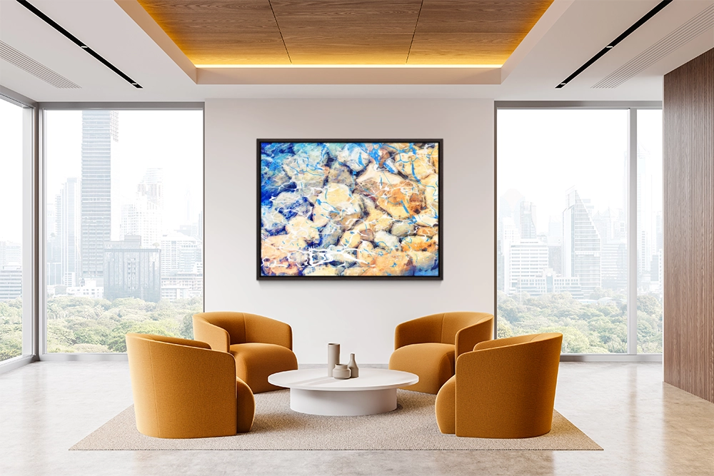 Energy and serenity of moving water with soft yellows and brows, and blues.
